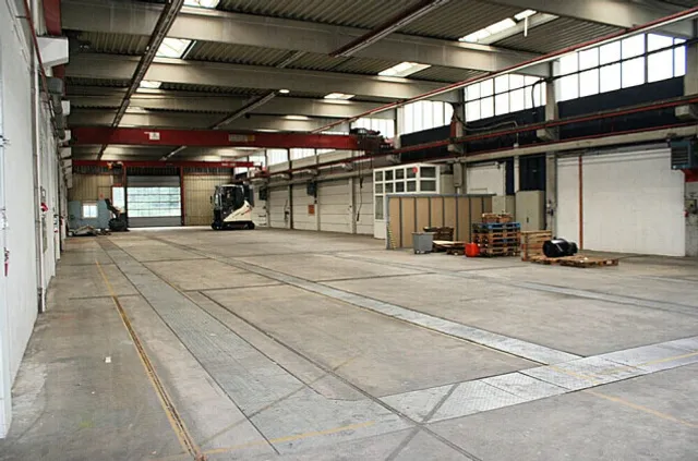 Each bay has electric sectional doors, 5 in total. The hall height at the lower edge of the trusses is approx. 6 m. There are also a total of 7 overhead cranes with different lifting capacities - 2t to 6.3t - in the halls.