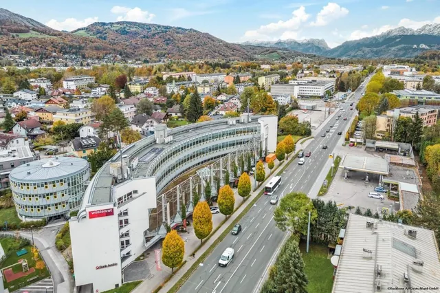 The infrastructure of the office complex includes a total of 180 garage spaces, various storage areas and technical rooms, as well as a district heating connection and a workshop. Security and convenience are guaranteed by keycard-protected access, three passenger elevators, a fire alarm and CO warning system and an efficient ventilation system. A photovoltaic system was retrofitted on the flat roof in 2020 to generate energy. A fiber optic connection is provided by both Salzburg AG and A1. On the side facing Alpenstrasse, the building is equipped with a glazed noise barrier that promotes the well-being of employees during working hours.