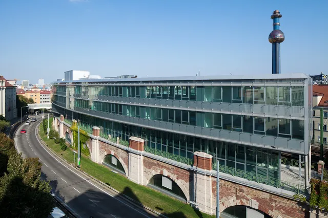 The architecturally striking building complex was erected in 2008 and combines the historic structure of the light rail arches designed by Otto Wagner with modern architecture. The building consists of 3 sections with 7 upper floors and 3 basement floors. The "Skyline" has a total rental area of around 15,700 m² with flexibly configurable rental areas that meet the latest requirements.