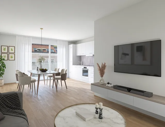 FURNISHED 3-room apartment with 17 m² luxury balcony surrounded by greenery NATURE-connected design LIVING at the gates of Vienna SECURE A KITCHEN VOUCHER FOR € 7,500 WHEN YOU BUY AN APARTMENT This designer new-build project in an exclusive Vienna Woods location consists of two modern villas with a total of 17 freehold apartments and offers everything the heart desires for living and opens up a true living and sports experience for nature lovers with countless leisure activities right on the doorstep in all seasons. Energy system at the cutting edge Heating & cooling by air heat pump in combination with energy-efficient underfloor heating Hot water preparation via a separate domestic hot water heat pump, which is integrated into the air heat pump system Heating requirement of 37.85 kWh/m²a Enjoy the fantastic view of the Vienna Woods from your new dream apartment with three rooms from the luxurious balcony or watch the sunset over dinner. The approx. 17 m² balcony offers a luxurious open space with a great view of nature for family and friends, extending the living area from the open-plan kitchen/living room. The two bedrooms also offer maximum relaxation value. Enjoy a sensational view of the greenery from the bedrooms with direct access to the balcony. Quality living with high-quality furnishings offers maximum living comfort: High-quality and stylish materials round off the modern green living. Large glazed areas allow plenty of daylight into the eat-in kitchen. The parquet flooring - oak plank - brings nature directly into your own feel-good oasis. In addition, many extra designs, such as the high interior doors measuring 2.20 m, create a special living ambience. Underfloor heating with individual room control in the living areas provides cozy warmth in winter and cooling in the summer months. Large glazed fronts with triple insulating glazing bring plenty of daylight into the living and sleeping areas. The sanitary area is fitted with porcelain stoneware. The bathroom has a modern shower and invites you to relax. The washbasin area is adorned with a wall mirror and an additional bar radiator for towels is always within easy reach. The adjoining toilet is also equipped with branded products.