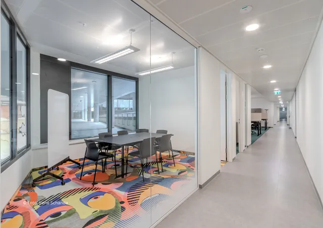 Ein begrünter Innenhof sowie eine großzügige, öffentlich zugängliche Dachterrasse schaffen attraktive Aufenthaltsbereiche und bieten Raum für Erholung und informellen Austausch. Dadurch entsteht ein Arbeitsumfeld, das Innovation, Komfort und moderne Infrastruktur miteinander verbindet.