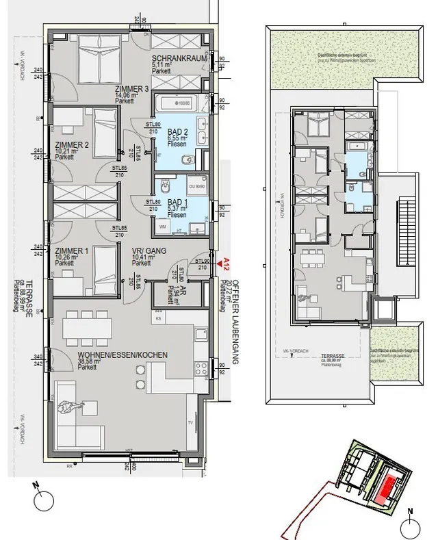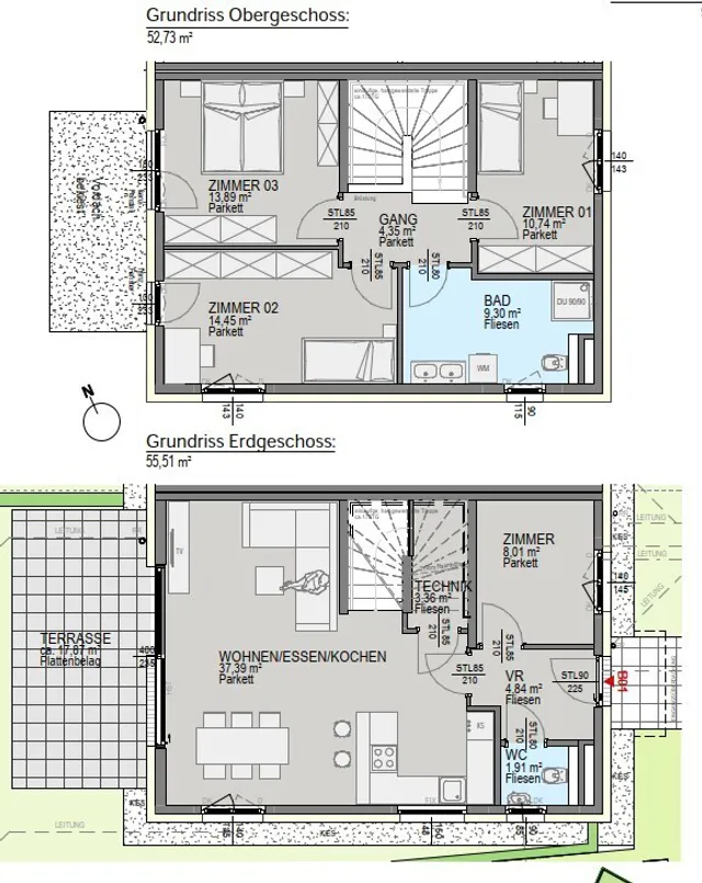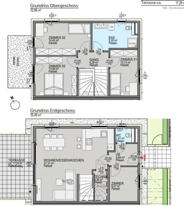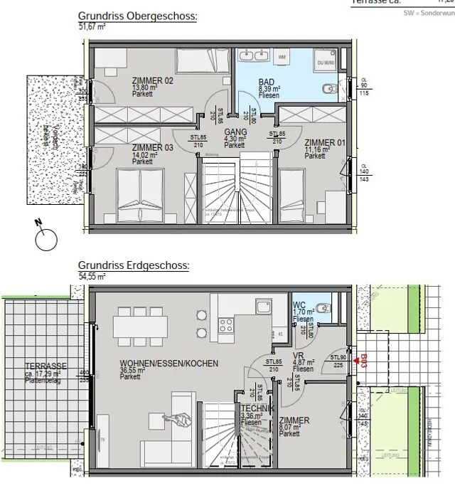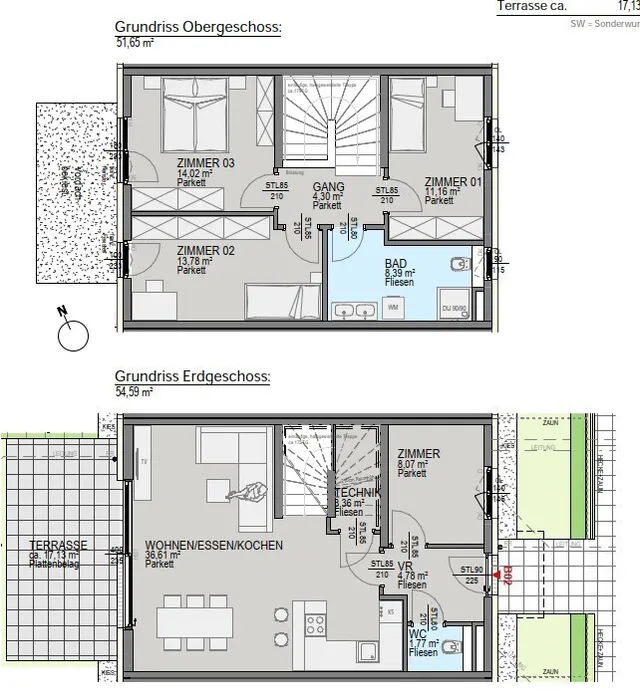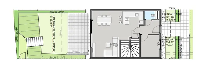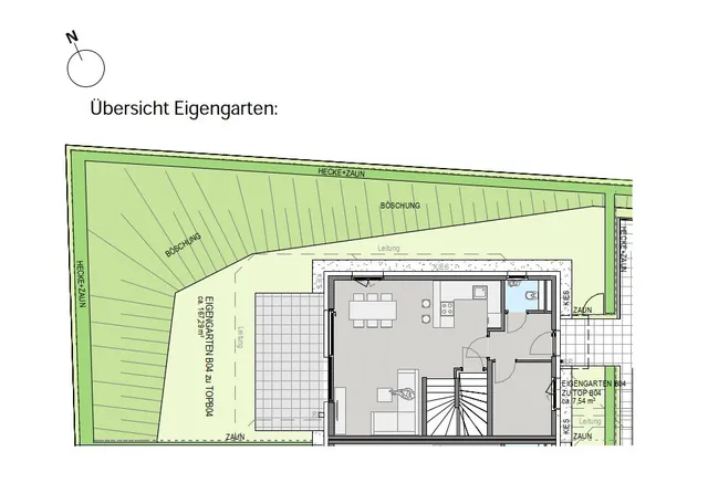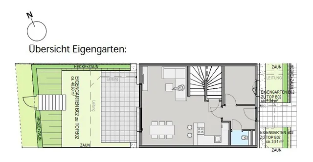 Ergänzend dazu entstehen in der Waltendorfer Hauptstraße 55b vier moderne Reihenhäuser, die ein urbanes Wohnen mit ausgeprägtem Hauscharakter ermöglichen. Die zweigeschoßigen Häuser bieten Wohnflächen zwischen ca. 106,22 m² und 108,24 m² und verfügen jeweils über Balkon, Terrasse sowie einen privaten Garten mit großzügigen Grünflächen. Auch den Reihenhäusern sind Kellerflächen sowie zugeordnete Stellplätze zugewiesen.