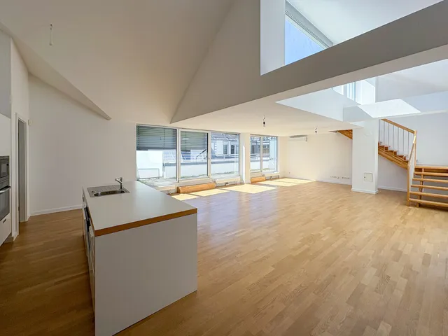 Vom Wohnbereich aus führt eine Treppe ins obere Geschoß zum Zugang zur Hauptterrasse am Dach, mit ca. 45 m².