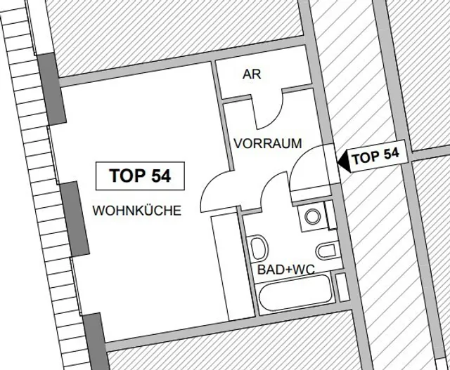 Über den Vorraum gelangen Sie in die helle Wohnküche, die genügend Platz für Kochen, Wohnen und gemütliches Beisammensein bietet. Das Badezimmer ist mit WC und Dusche ausgestattet und verfügt über eine praktische Raumaufteilung. Ein zusätzlicher Abstellraum sorgt für wertvollen Stauraum – ein seltener Vorteil in dieser Wohnkategorie.