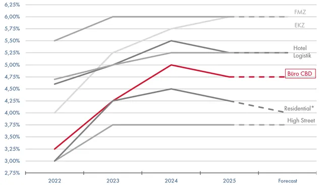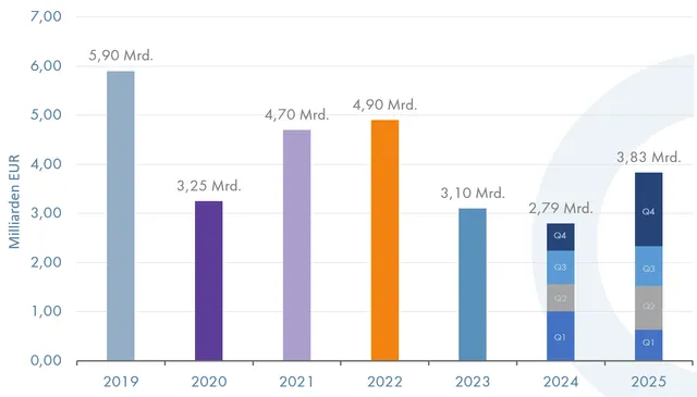 Mit dem vierten Quartal 2025 beläuft sich das Transaktionsvolumen auf etwa 3,83 Milliarden Euro und liegt somit über eine Milliarde über dem Vorjahresniveau, wobei insbesondere Immobilienverkäufe einiger Immobilienfonds und langjähriger Bestandshalter zur Liquiditätsbeschaffung für Mittelabflüsse dominierten, vor allem im Hotel- und Wohnsektor. Das BIP ist im Vergleich zum Vorquartal um 0,42% gestiegen, die Inflation lag bei 3,80%. Die EZB hat den Leitzinssatz der Einlagenfazilität seit Juni dieses Jahres nicht verändert, er liegt weiterhin bei 2,00%. Institutionelle Investoren zeigten 2025 wieder vermehrtes Interesse, insbesondere an Core-Assets wie Büro, Hotel, Logistik und Zinshäusern. Trotz stabiler Nachfrage hemmen hohe Baukosten und schwierige Finanzierungsbedingungen den Neubau. Eigenkapitalstarke Investoren, wie Family Offices oder Pensionsfonds, bleiben in diesem volatilen Marktumfeld besonders aktiv.