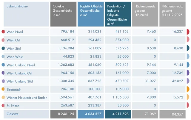 Der Bestand an Logistik- und Industrieflächen im Raum Wien beträgt rund 8,25Mio. m². Im zweiten Halbjahr 2025 wurden rund 71.000m² Fläche umgesetzt. Der Flächenumsatz teilt sich zu 85 % auf Logistik- und zu 15 % auf Produktionsimmobilien auf. Der Gesamtumsatz laut dem VRF 2025 beträgt somit 104.357 m². Insolvenzen und Umstrukturierungen führen dazu, dass mehr Flächen auf den Markt kommen. Der Leerstand bleibt dennoch auf einem niedrigen Niveau. Entwickler fokussieren zunehmend auf Brownfield-Projekte. Die Mieten liegen zwischen 7,00 und 9,00 EUR/m², beeinflusst durch Lage und Qualität; steigende Baukosten und Zinsen treiben die Preise weiter nach oben.