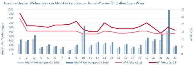 Der Eigentumsmarkt verbucht einen leichten Anstieg der Transaktionszahlen. Die Quadratmeterpreise für Erstbezugswohnungen verzeichnen bereits in einigen Bezirken Rückgänge. Gebrauchte Wohnungen bleiben weitgehend stabil. Seit Wegfall der KIM-Verordnung Mitte 2025 wird Kreditvergabe langsam wieder angekurbelt. Der Trend zeigt, nachhaltige Neubauprojekte mit kompakten Grundrissen sind stark gefragt. Die EZB senkte im zweiten Quartal 2025 den Hauptrefinanzierungszinssatz auf 2,15 %, der seither auf gleichem Niveau ist. Gleichzeitig hemmen der Mangel an leistbaren Grundstücken sowie gestiegene Baukosten und Bauverzögerungen den Neubau – ein langfristig anhaltend geringes Neubauangebot ist zu erwarten.