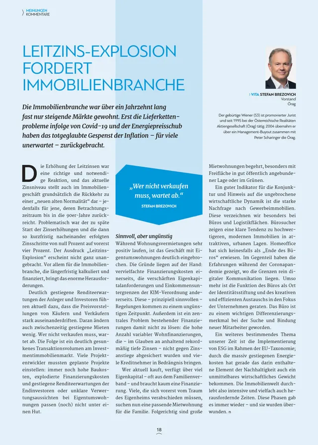 Die Erhöhung der Leitzinsen war eine richtige und notwendige Reaktion, und das ak tuelle Zinsniveau stellt auch im Immobiliengeschäft grundsätzlich die Rückkehr zu einer „neuen alten Normalität“ dar – jedenfalls für jene, deren Betrachtungszeitraum bis in die 90er-Jahre zurückreicht. Problematisch war der zu späte Start der Zinserhöhungen und die dann so kurzfristig nacheinander erfolgten Zinsschritte von null Prozent auf vorerst vier Prozent. Der Ausdruck „Leitzins-Explosion“ erscheint nicht ganz unangebracht. Vor allem für die Immobilienbranche, die längerfristig kalkuliert und finanziert, bringt das enorme Herausforderungen.
